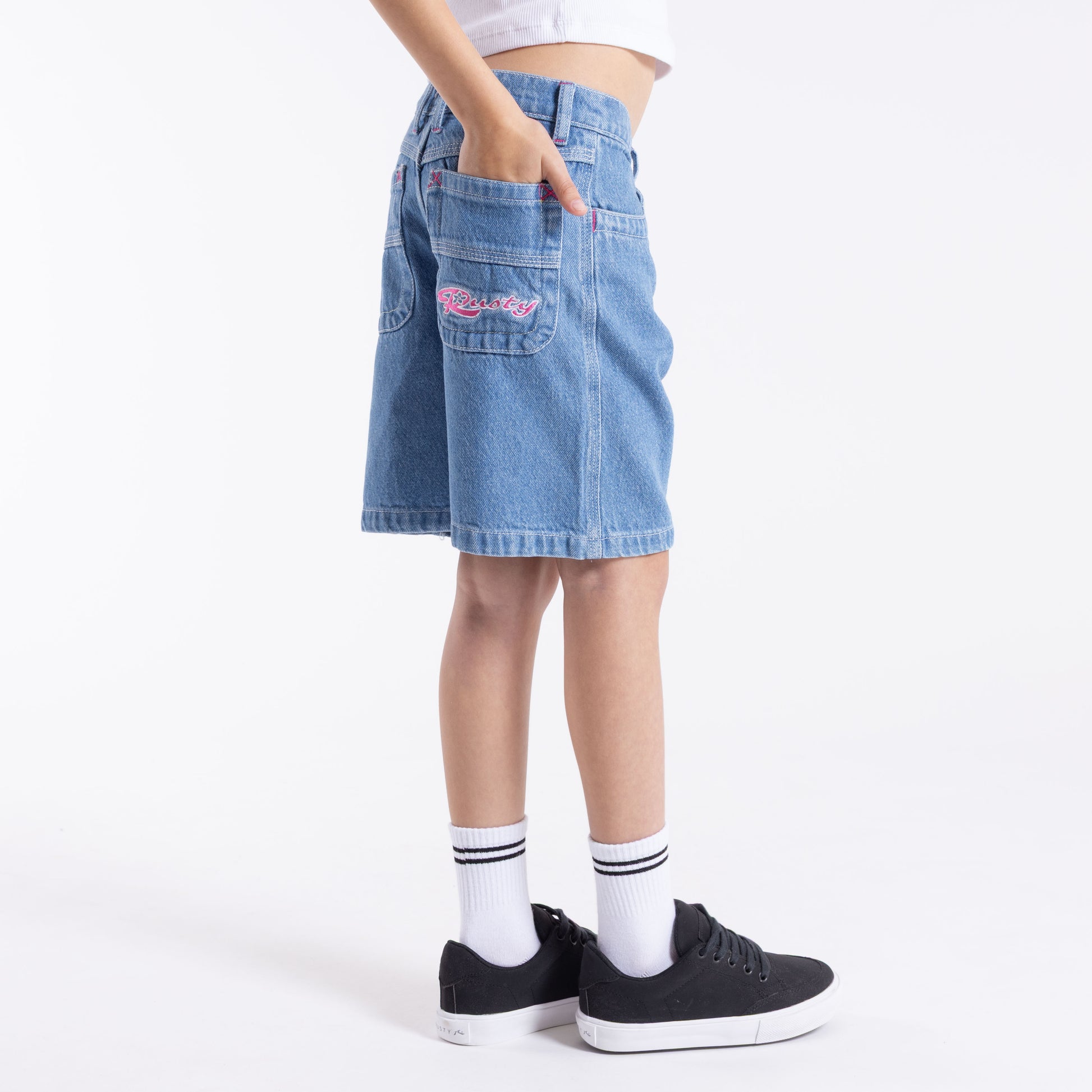 Detalles: Bermuda niñas calce relajado, con bordados en bosillo delantero y trasero. Ajuste interno en cintura por medio de elástico y botón.