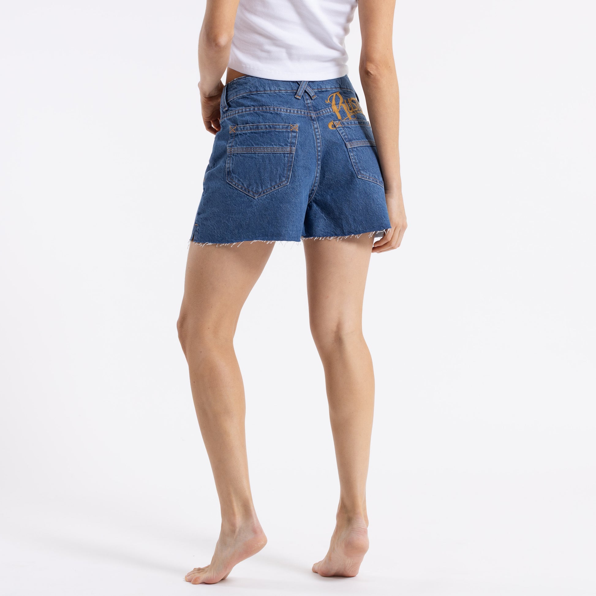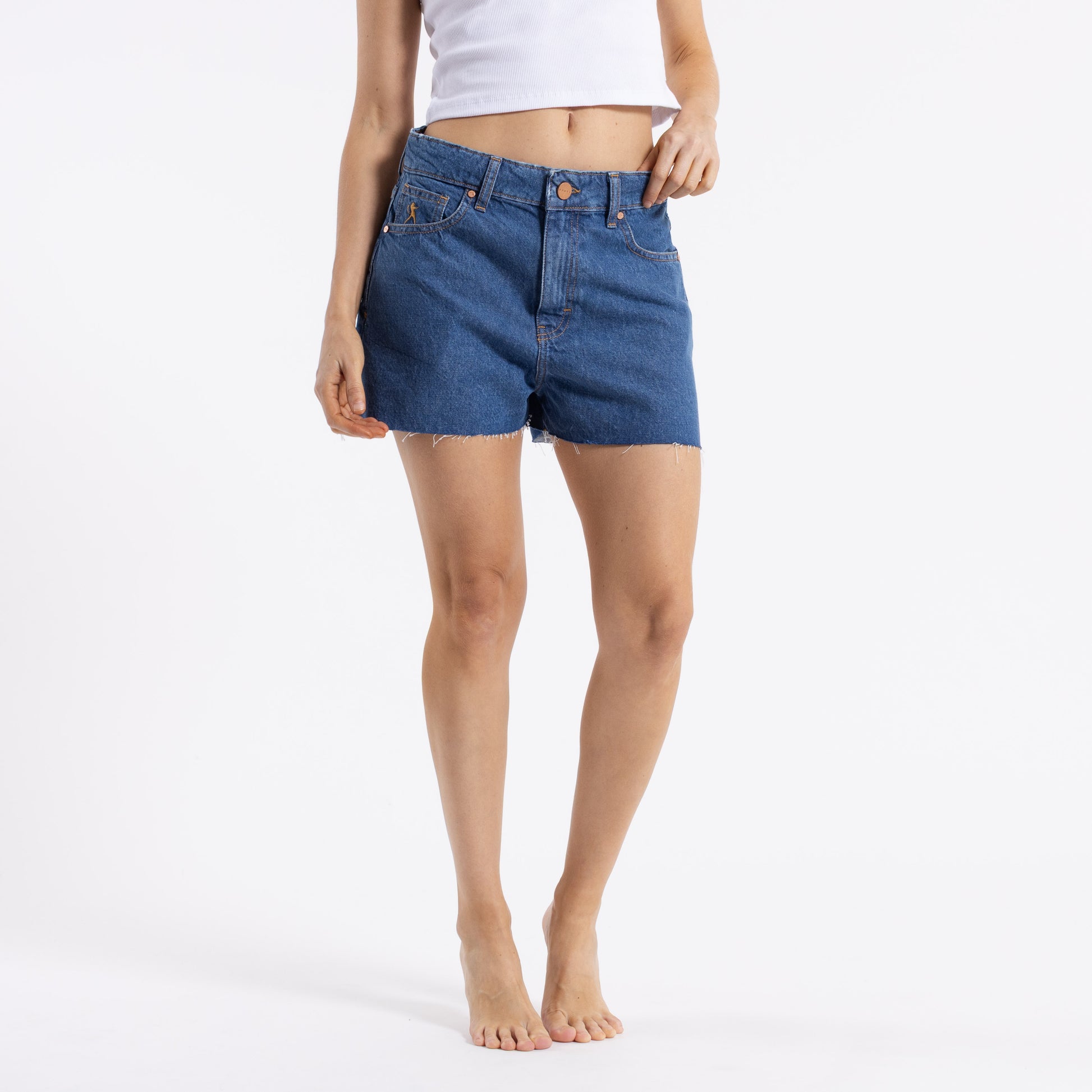 Detalles: Short denim, pierna suelta, tiro medio. Bordado sobre canesú espalda. Bolsillos con recorte y atraques. Lavado stone medio.