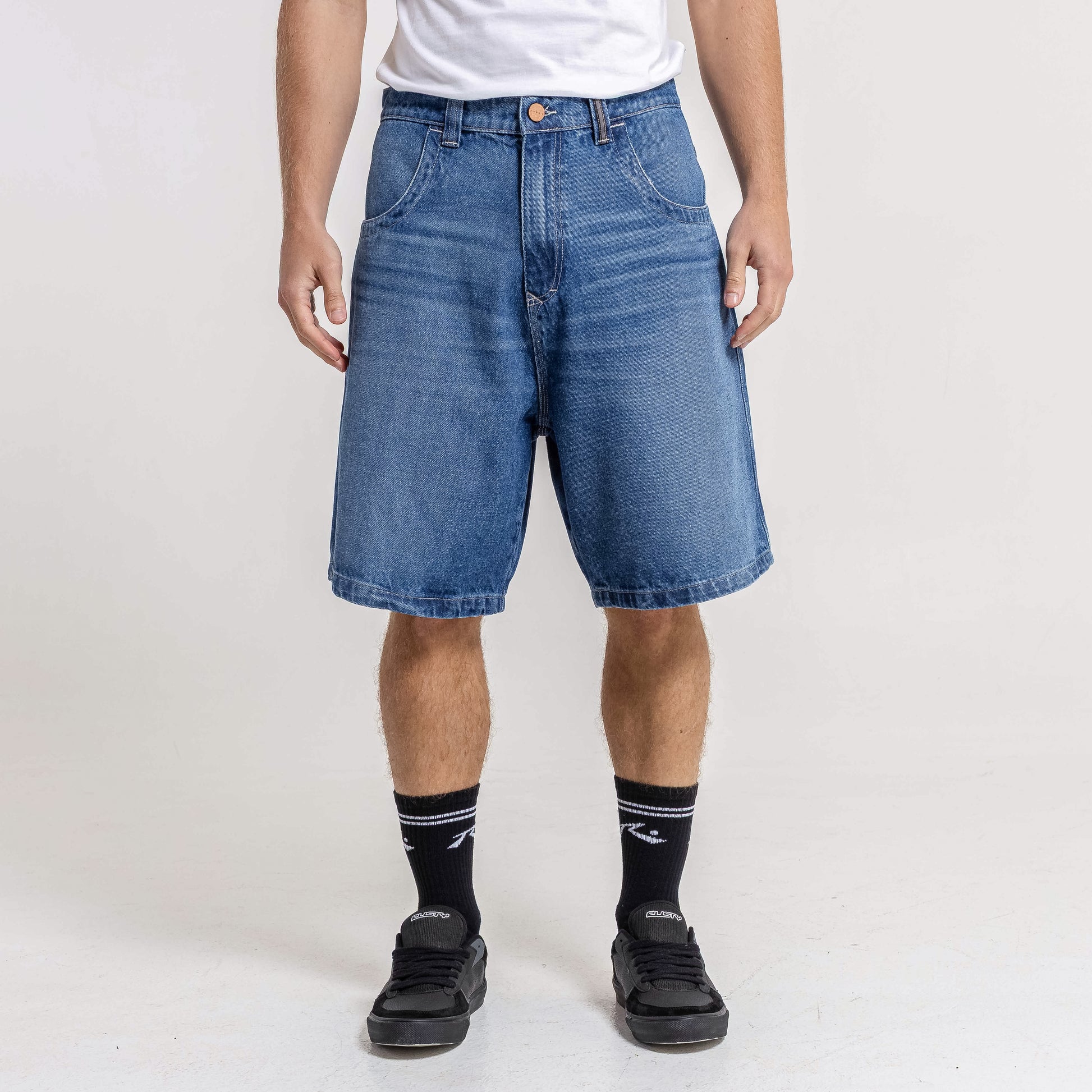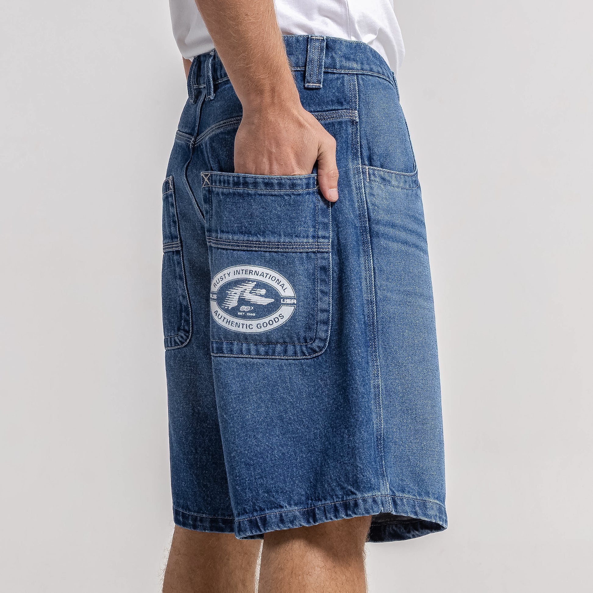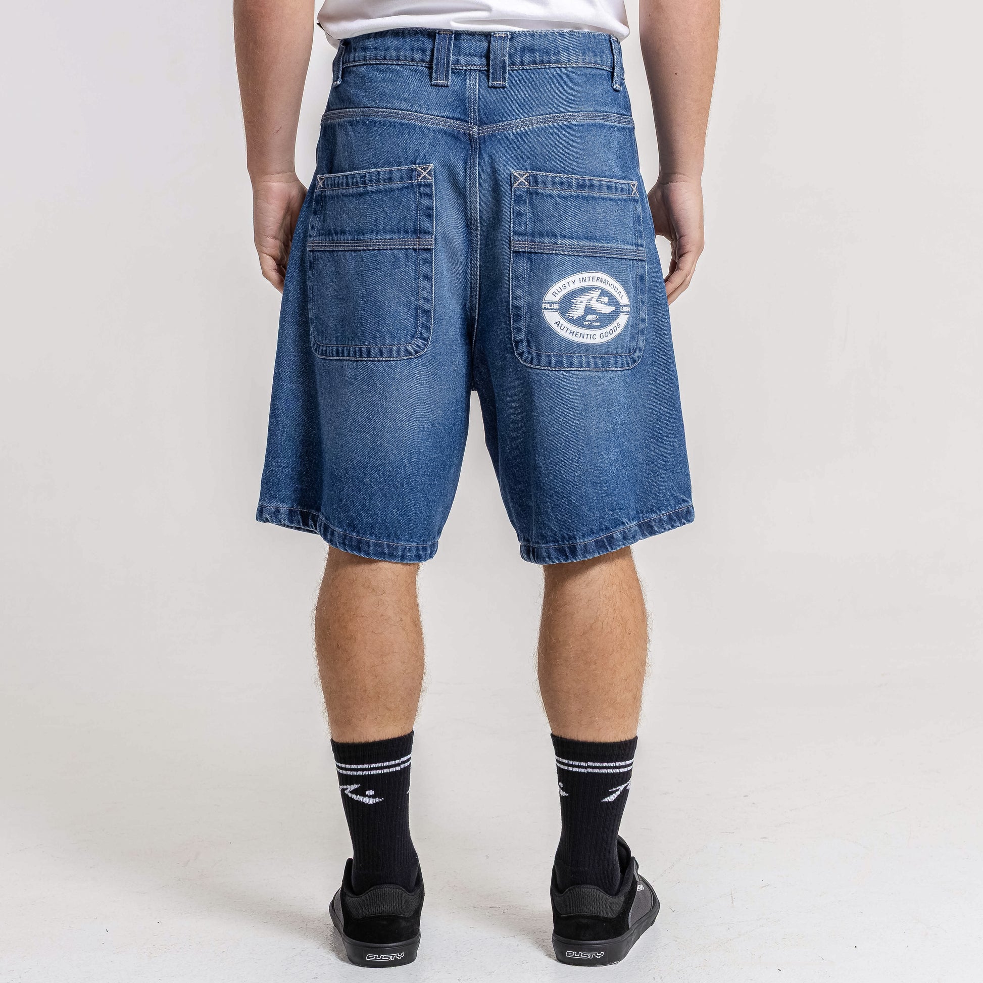 Detalles Bolsillos traseros oversize con arte bordado. Lavado con localizado y matizado. Botón cobre italiano.