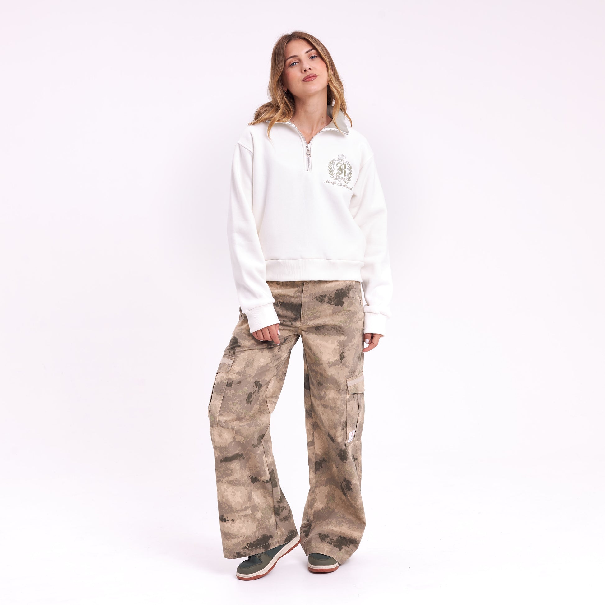 Un buzo que levanta cualquier look sin esfuerzo. El cuello alto con cierre te deja regular la apertura según el momento — más cerrado en la mañana, más abierto cuando afloja el día. La frisa esmerilada en algodón puro se siente suave contra la piel, con ese toque premium que notás apenas lo tocás. El calce relaxed te da soltura real, sin quedar holgado de más. Combinalo con un jean recto y zapatillas o sobre una bermuda cargo en días frescos. El interior a contratono suma un detalle que se ve cuando bajás el cierre.