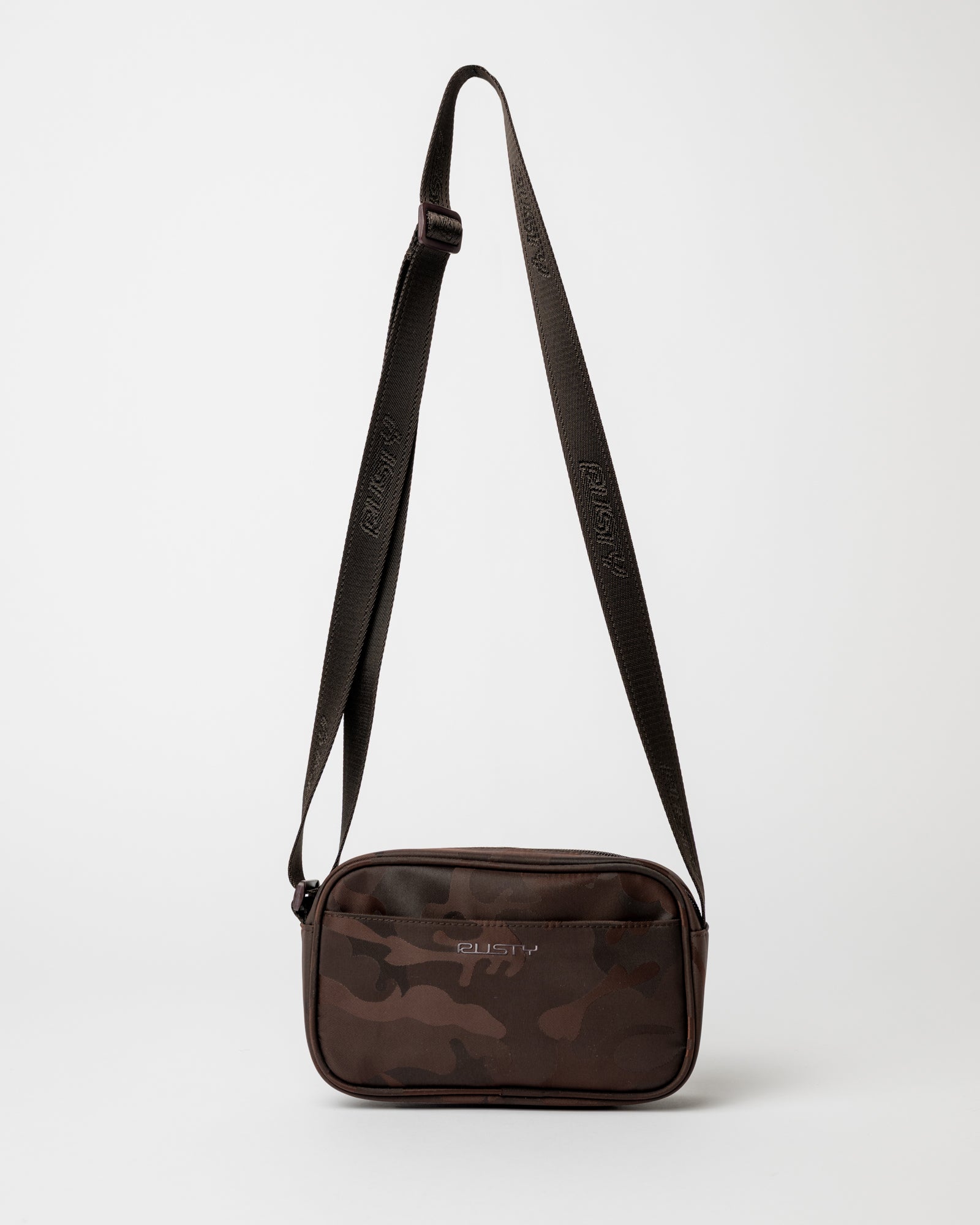Una bandolera que resuelve lo básico sin complicarte: celular, llaves, billetera, todo a mano y el cuerpo libre. El nylon jacquard con diseño camo le suma textura y actitud sin gritar demasiado. El bolsillo frontal te da acceso rápido a lo que más usás, mientras el cierre principal mantiene todo seguro. La correa tejida con logo Rusty y el estampado en relieve al frente le dan identidad sin esfuerzo. Cruzala y salí — a la calle, a un recital, al skatepark o a hacer tiempo por el centro.