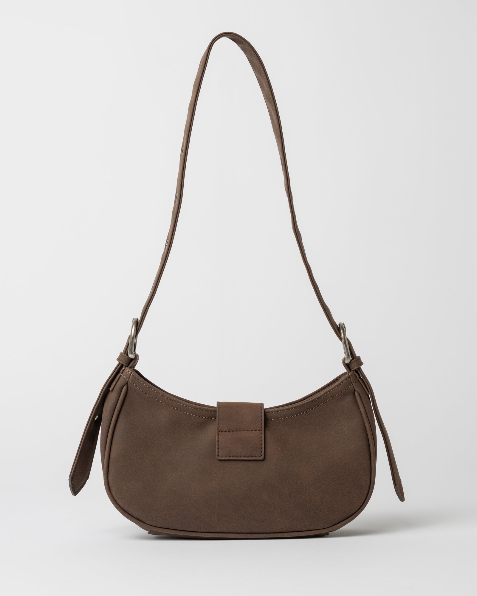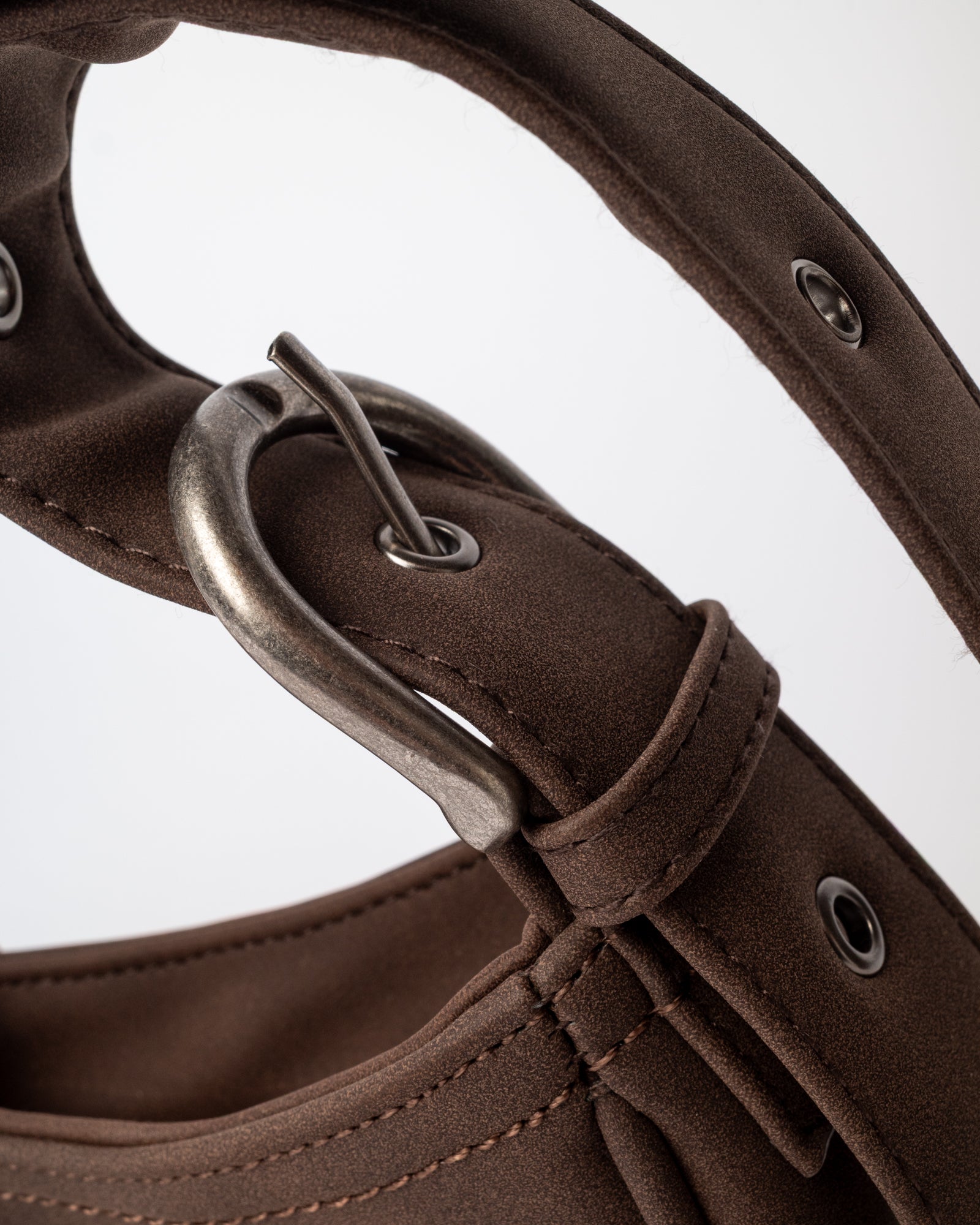 Una cartera de cuero gamuzado sintético con textura suave al tacto y ese tono pinecone que combina con todo sin esfuerzo. El tamaño mediano la hace práctica para salir liviana pero con lo que necesitás: billetera, celular, llaves y algo más. La correa regulable con hebillas metálicas te deja llevarla cruzada o al hombro según el momento. Funciona igual con un jean y remera básica que con un vestido para una salida de noche. Tiene traba con hebilla y chapa de marca que le suman un toque de detalle sin recargarse.