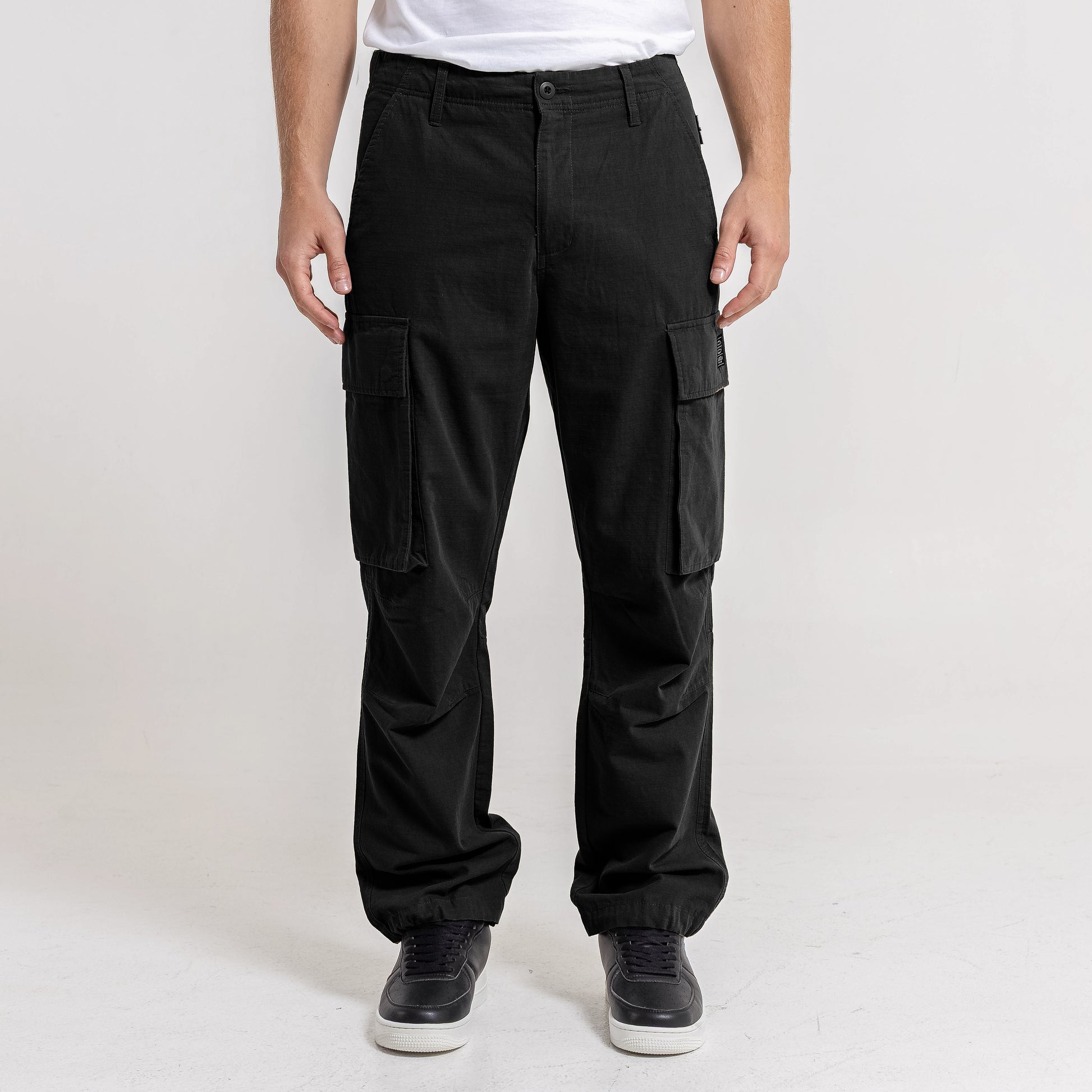 Detalles Bolsillos cargo laterales. Bolsillos traseros con tapa. Pinza de confort en rodillas. Cordón de ajuste en botamanga.