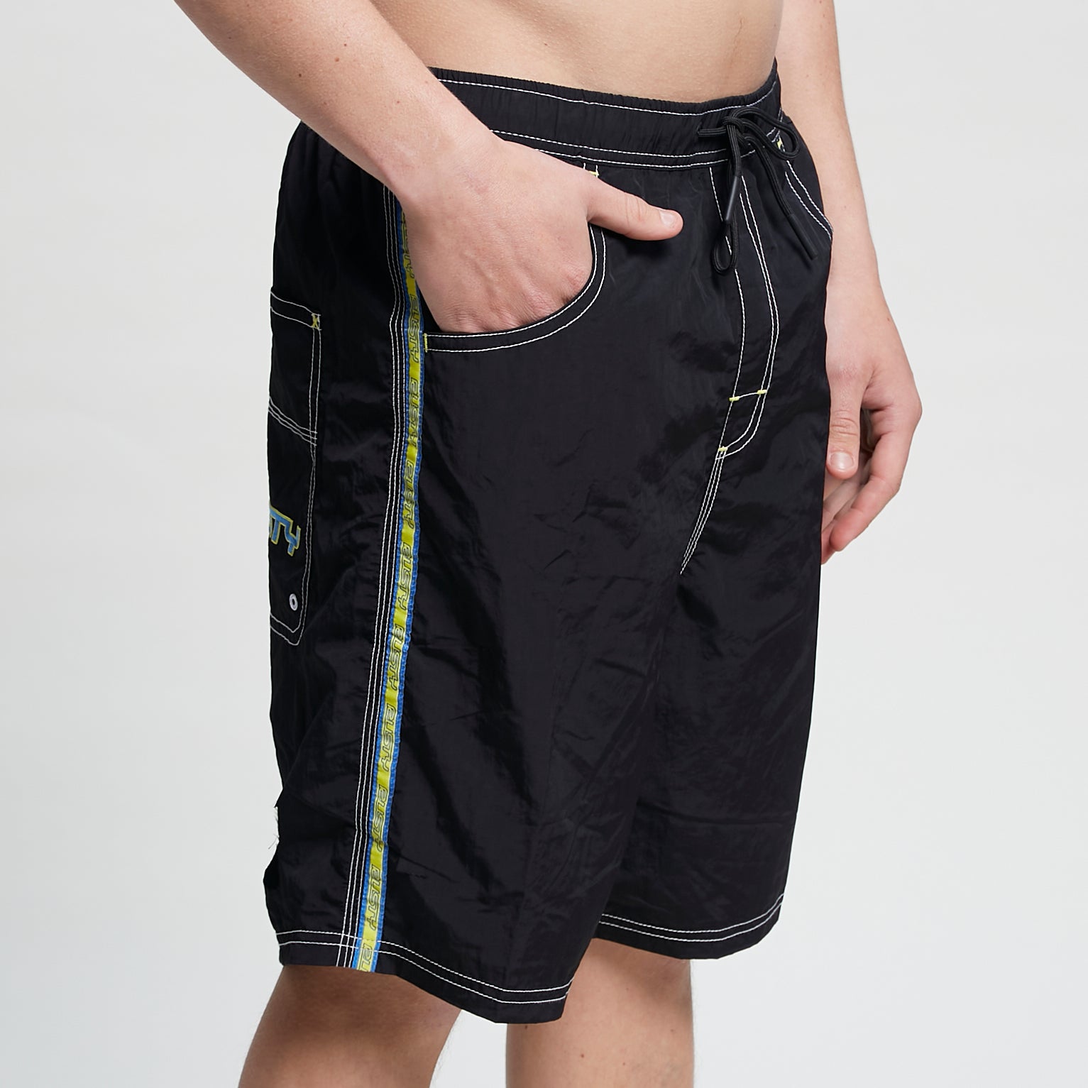 Boardshort de cintura elastizada, con cordón tubular y punteras de goma. Dos bolsillos laterales y un bolsillo trasero plaque con ojalillos de desagote bordados. Galón tejido en laterales. Costuras a contratono.
